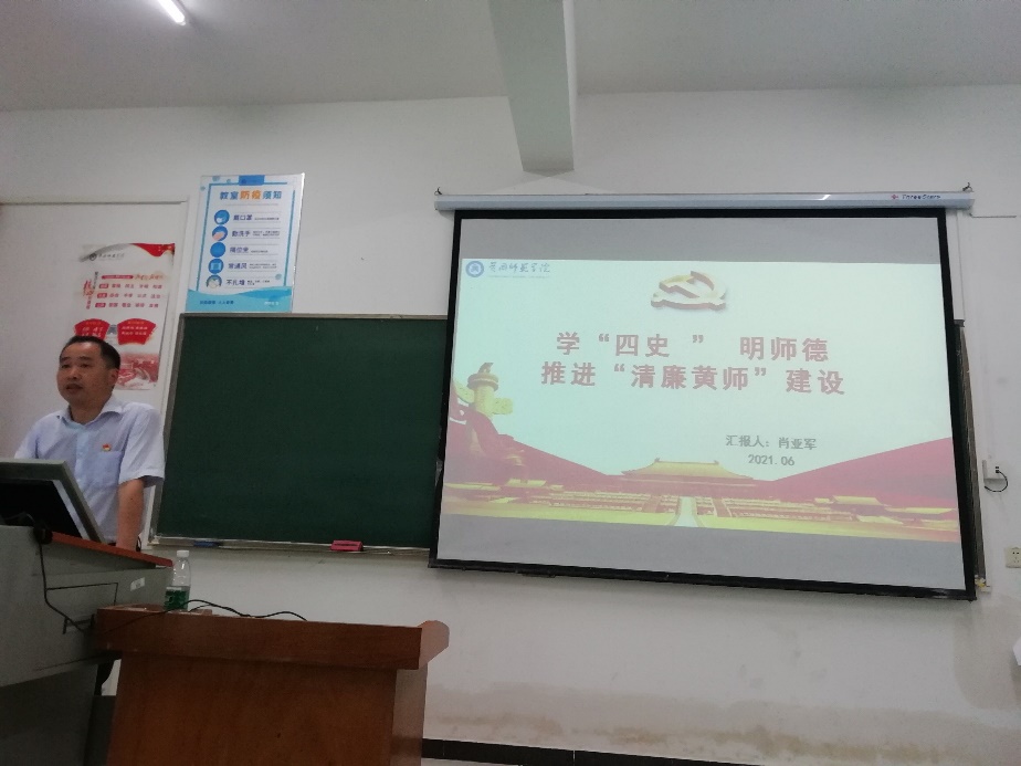 肖亚军从习近平总书记关于师德师风的重要论述摘编、高校教师为什么要学“四史“、新时代高校教师职业行为十项准则、违反高校教师职业行为十项准则典型案例、实施“教风清新”工程,推进“清廉黄师”建设五个部分进行了汇报。重点讲述教师思想政治和师德师风建设工作是凝心铸魂、立德树人的基础性工程。我国正处于实现中华民族伟大复兴的关键时期,高质量发展是经济社会发展的主题,是教育工作的主题,这对教师队伍建设、对师德师风工作提出了新的更高要求。教师的思想政治素质和师德师风关乎员工成长成才,关乎教育改革发展,关乎社会文明风尚,关乎国家长治久安。广大教师要牢记习总书记的嘱托,担负起立德树人的使命;要以党史学习教育为重点,将“四史”学习作为 “必修课”,通过学习教育,坚定理想信念、厚植爱国情怀、 涵养高尚师德。学好“四史”,是新时代高校教师加强师德师风建设的必然路径,是成为一名新时代优秀高校教师的必然要求。建设一支具有高尚的师德师风的教师队伍,是建设“清廉黄师”必然之义,是学校建设“全省一流、全国知名”高水平师范大学的坚强保障。