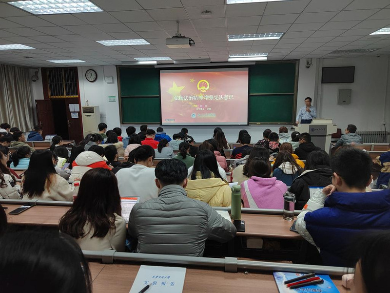 讲座围绕学宪法 讲宪法内容展开,辅导员金晓刚老师结合实际和现实情境,讲认识、谈体会,充分表达了自己对宪法的理解和情感。同时学院向所有同学发出倡议:从自己做起,从身边小事做起,自觉做到学法、知法、守法、用法,推广宪法,遵守宪法的小主人,最后要求所有同学登录教育部全国青少年普法网,完成相应学习和考试任务。
