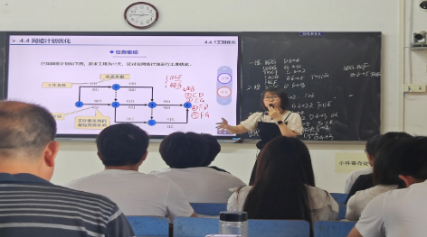 孙晓丽老师讲授的教学内容为《工程项目管理》中的“网络计划优化”章节,以知识回顾切入主题,对工期优化原理做了深入浅出的讲解,在讲解过程中,从设置教学问题、教学设计、课堂分组实施、课后任务演练四个方面对教学做了详细解说,同时利用超星慕课平台,进行现场学练结合、线上线下互动答题。