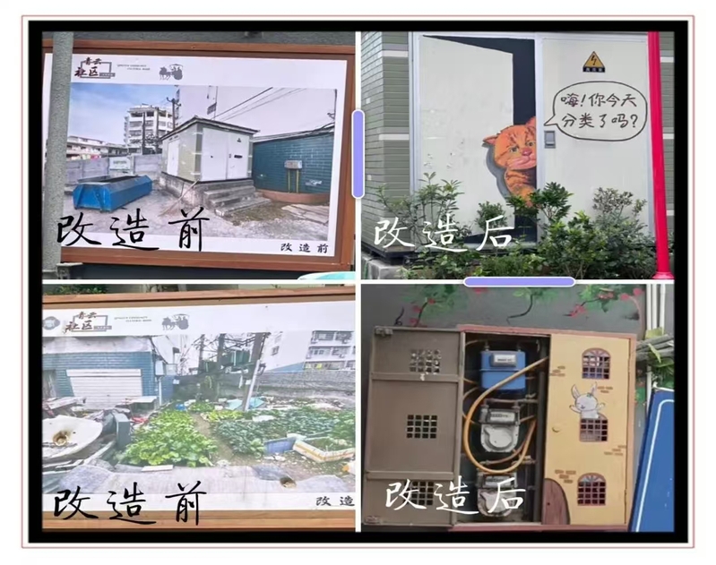 同时新增“大修厂事迹”“轮胎厂事迹”“市井文化,民生记忆”等文化模块,用老照片和老物件呈现社区历史辉煌,较好保留传承了社区历史文化记忆。还有趣味涂鸦墙,把憨态可掬的动漫图画与社区点滴结合起来,更添生活气息与艺术设计。改造完工后,居民喜笑颜开,改造前脏乱差,改造后人人夸。小区居民潘真说:“小区以前脏乱差,现在看起来干净美观,给我们生活带来了很大的便利,小区的改造让大家感觉很满意。”