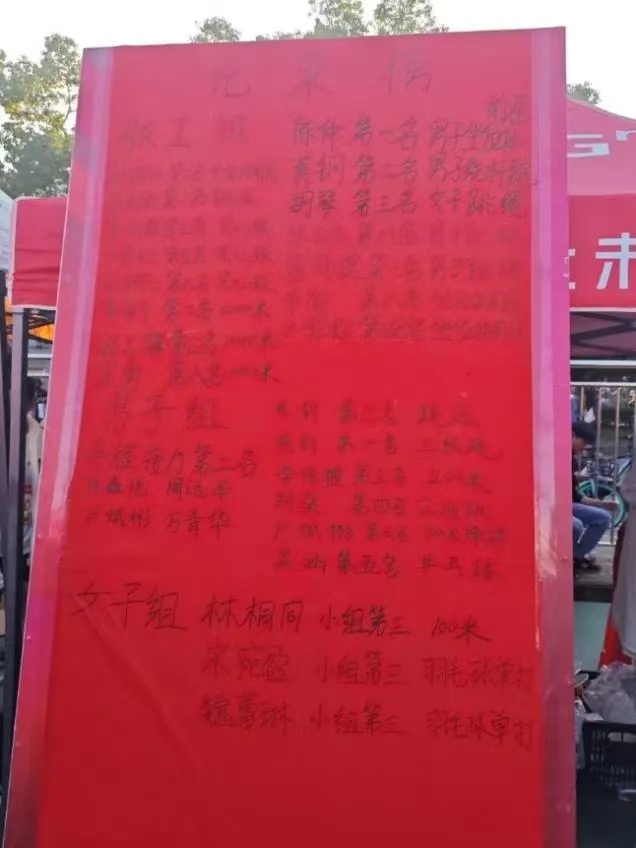 百米跑道上,发令枪响的瞬间,运动员们如离弦之箭飞奔而出。他们目光坚定,脚步飞快,向着终点冲刺。观众们的呐喊声、加油声此起彼伏,整个赛场沸腾起来。其中,林桐同同学以惊人的速度冲过终点线,获得了女子100米的小组第三名,赢得了全场热烈的掌声。李传根同学以风驰电掣的速度获得了男子200米的第三名。