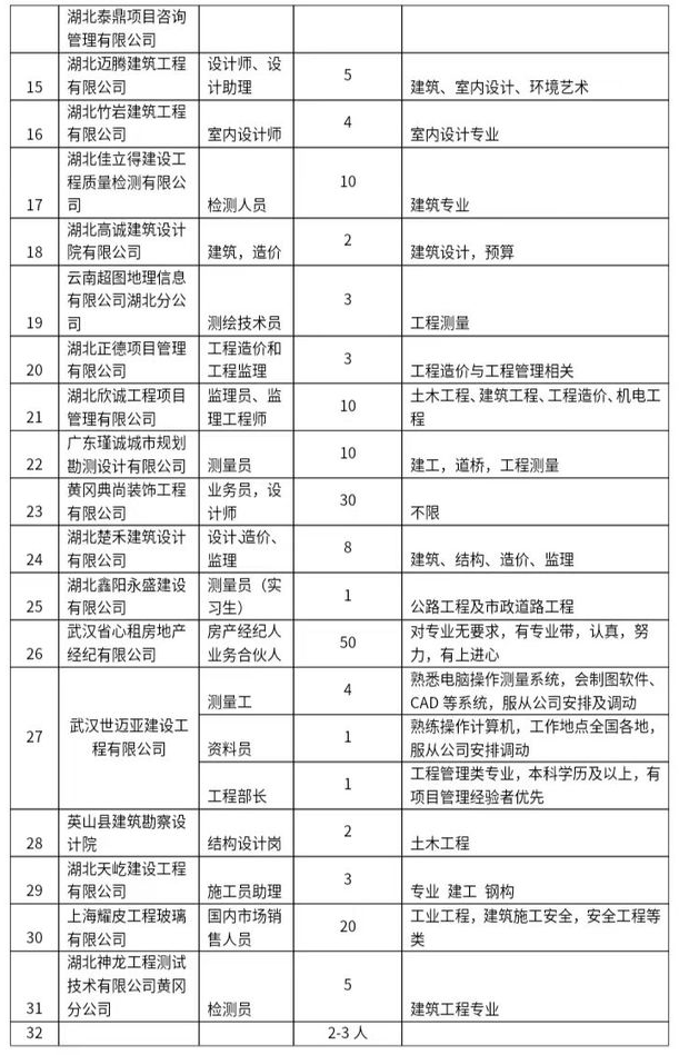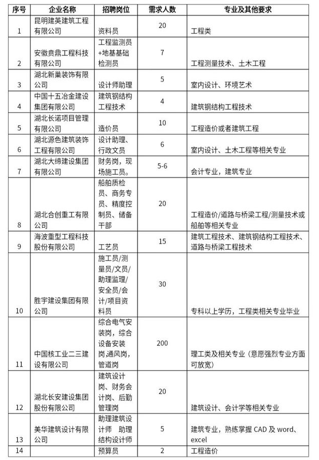 此次专场招聘会有39家来自全国各地的建筑类企业应邀参加,主要针对建筑类专业本专科生提供资料员、造价员、测量员、设计师、施工员、监理员及预算员等岗位总计600余个。